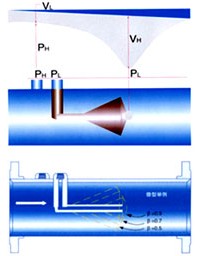 V錐流量計工作原理: 是一種差壓流量儀表,迄今為止以差壓原理設計的流量儀表已經有一百多年的應用歷史了。差壓原理是基于密封管道中的能量轉換原理,也就是說對穩定流體,流量與管道中介質流速的平方根成正比。當介質接近錐體時,其壓力為P1,在介質通過錐體的截流區時,速度增大,壓力降低為都通過錐形流量計的取壓口引到差壓變送器上,當流速發生變化時,錐形流量計的兩個取壓口之間的差壓值會增大或縮小。 錐流量計在進行流量計算時所采用的計算公式同其他差壓流量儀表相同,但其截流元件的獨特設計,迫使管道中心的介質繞著錐體流動,與其他差壓流量計相比這樣有很多優點。我們可以借助理想狀態流速曲線分布圖來理解錐形流量計的性能。管道中的流體沒有受到任何干擾和阻礙,即是我們所說的理想流態,他的流速分布均勻,靠近管壁的流速幾乎為零,管道中心的流速達到大,靠近管壁的流速幾乎為零,是由于管壁對介質的摩擦力造成的。由于錐體懸掛在管線中心,他直接同流體的高速區接觸,迫使高速區的流體同近管壁低速區的流體相混合從而使流速均勻化。所以即使流速很低,錐形流量計仍能使流體與管道中心的高流速連續作用產生正確差壓。