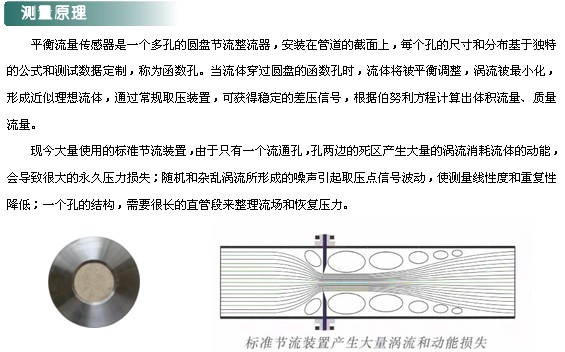 平衡流量傳感器是一個多孔的圓盤節流整流器,安裝在管道的截面上,每個孔的尺寸和分布是基于特殊的公式和測試數據而定制的,稱為函數孔。