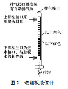 由于在磁翻板液位計的進(jìn)水接口法蘭處安裝有閥門, 在平時不需要水泵水輪機(jī)排水檢修時, 該閥門處于關(guān)閉狀態(tài), 必要時可以通過裝置底部的排污閥門把液位計主導(dǎo)管內(nèi)的水排空。
