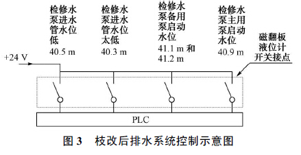 現(xiàn)場安裝磁翻板液位計時, 裝置標(biāo)尺的0 位, 對應(yīng)的實地高程為EL .40 .0 m 。浮子開關(guān)設(shè)定5 個水位動作值, 檢修水位低開關(guān)量報警值對應(yīng)的高程為40 .3 m ;停止所有檢修水泵的開關(guān)量, 所對應(yīng)的高程為40 .5 m ;啟動主用檢修水泵的開關(guān)量, 所對應(yīng)的高程為40 .9 m ;啟動檢修水泵主用泵的開關(guān)量, 以及要求手動啟動大泵, 并作為水位高報警上送上位機(jī), 所對應(yīng)的高程為41 .1 m 與41 .2 m , 兩個開關(guān)量并列接入。全部開關(guān)量分別送入PLC , 如圖3所示。