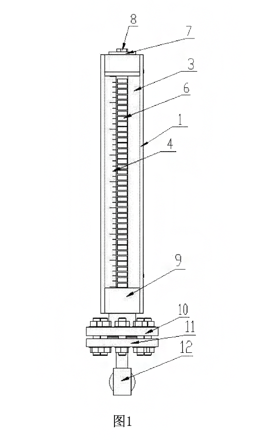 以下附圖僅旨在于對本新型做示意性說明和解釋,并不限定本新型的范圍。其中圖是本新型磁翻板液位計實施例的結構示意圖