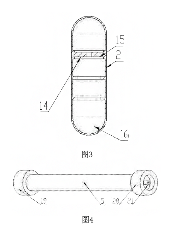 磁浮球呈膠囊狀且內(nèi)部設有空腔,磁浮球一端開口,磁浮球的空腔內(nèi)安裝有兩個加強支撐環(huán),兩加強支撐環(huán)之間安裝有環(huán)形**強磁鋼塊,磁浮球開口端焊接有封堵頭,磁浮球質(zhì)量較輕,可以在液位計主體的磁浮球通道中浮起,兩個加強支撐環(huán)一方面可以保證磁浮球不會在受到較大壓力時發(fā)生形變,另方面可以固定環(huán)形**強磁鋼塊,環(huán)形**強磁鋼塊增大了磁浮球與磁翻板的磁耦合強度,使環(huán)形**強磁鋼塊在磁浮球內(nèi)更加穩(wěn)定,焊接的封堵頭有效保證磁浮球內(nèi)部不會進入液體,增長了使用壽命。