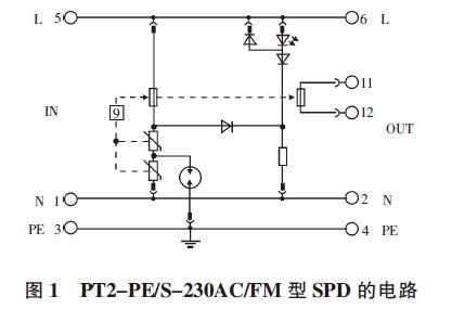 (1)圖1 電路由氣體放電管(粗保護)、壓敏電阻(細保護)、發光二極管、熔絲組成。IN 端接電涌電流來向, OUT 端接被保護設備, 端子L 和N 分別接1 對220 V 火線、零線。端子3 和4 端子任選1 個接地, 如果金屬導軌已接地, 此接地線可不接。端子11 和12 接1 對開關量報警回路。當電涌電流從IN 端進入SPD, 細保護壓敏電阻在25 ns 內啟動, 限制火線、零線之間出現過電壓。當火線或零線電壓抬升至940 V 以上時,粗保護氣體放電管在100 ns 內擊穿, 對地放電,可泄放10 kA(8/20 μs)電涌電流, 壓敏電阻限制電壓至1.1 kV, 泄放完成后各器件恢復常態。當
