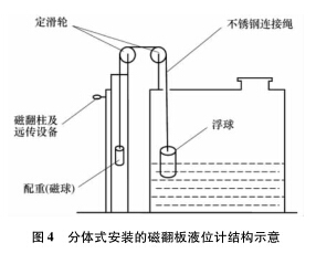 分體式磁翻板液位計(jì)的安裝步驟如下: ①通過計(jì)算浮力和配重, 在槽體頂部合適位置安裝定滑輪, 在槽外合適位子安裝磁翻板傳感裝置; ②用直徑為 3 mm 的不銹鋼繩連接浮子和配重, 鋼繩長度根據(jù)液位來計(jì)算。這里特別要注意, 磁翻板要反向安裝。