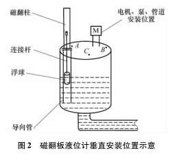 圖 2 中, B 點(diǎn)靠近電機(jī)和泵, 磁翻板液位計(jì)安裝在此處既影響電機(jī)及泵的檢修, 又因泵附近液位的環(huán)流波動(dòng)較大, 對(duì)浮子導(dǎo)向管沖刷嚴(yán)重, 故 B 點(diǎn)不合理; C 點(diǎn)處因有管道通過, 不便維護(hù)且影響管道和泵、 電機(jī)等的起吊更換, 故也不能選擇 C 點(diǎn); A 點(diǎn)遠(yuǎn)離泵和電機(jī), 且有足夠的空間安裝翻板, 便于維護(hù),所以 A 點(diǎn)較為合適。