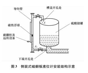 側(cè)面安裝方式的關(guān)鍵點(diǎn)在于: ①酸槽內(nèi)壁襯有瓷磚, 故引流管上開孔應(yīng)選擇槽蓋合適位置, 下孔好在進(jìn)口管上, 且均需加閥門, 便于維護(hù); ②考慮管內(nèi)硫酸在極端天氣時(shí)對(duì)磁翻柱及測(cè)量裝置的影響,因本公司循環(huán)槽溫度在75 ℃左右, 為避免夏天溫度過高影響傳感器測(cè)量, 冬天防凍, 管徑 D 應(yīng)在 80mm 以上可保證正常測(cè)量。