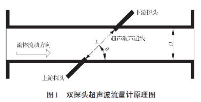 本研究針對(duì)一款雙探頭時(shí)差法超聲波流量計(jì)。時(shí)差法是利用聲脈沖波在流體中順向與逆向傳播的時(shí)間差來測(cè)量流體流速。雙探頭超聲波流量計(jì)原理圖如圖1所示。