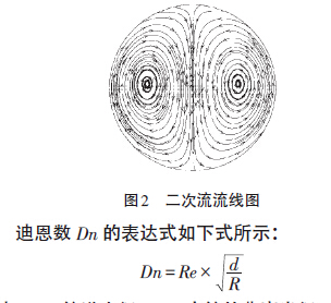 流體流經(jīng)彎管,管內(nèi)流體受到離心力和粘性力相互作用,在管道徑向截面上形成一對(duì)反向?qū)ΨQ渦旋如圖2所示,稱為彎管二次流。有一無量綱數(shù),迪恩數(shù)Dn 可用來表示彎管二次流的強(qiáng)度。當(dāng)管道模型固定時(shí),迪恩數(shù)Dn 只與雷諾數(shù)Re 有關(guān)。研究發(fā)現(xiàn),流速越大,產(chǎn)生的二次流強(qiáng)度越大,隨著流動(dòng)的發(fā)展二次流逐漸減弱。