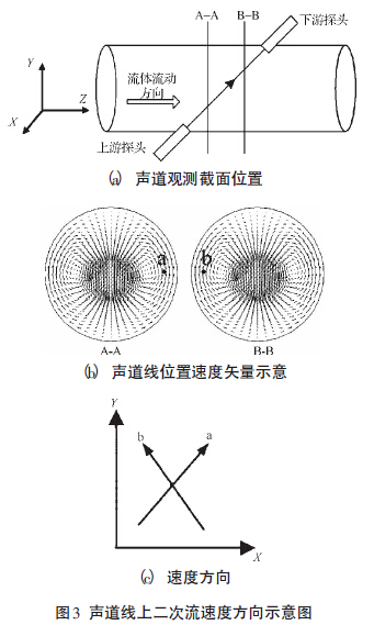 式中:d —管道直徑,R —彎管的曲率半徑。彎管下游形成的二次流在徑向平面的流動(dòng),產(chǎn)生了彎管二次流的垂直誤差和水平誤差。聲道線上二次流速度方向示意圖如圖3所示。本研究在聲道線路徑上取兩個(gè)觀察面A和B,如圖3(a)所示;聲道線穿過這兩個(gè)二次流面的位置為a和b,如圖3(b)所示。可見由于聲道線穿過截面上渦的位置不同,作用在聲道線上的二次流速度方向也不同,如圖3(c)所示。其中,徑向平面二次流速度在水平方向( X 方向)上的分速度,方向相反。