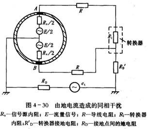 二是由地電流引起的同相干擾電勢。如果在流計附近存在大功率的電器設備,特別是因絕緣不好而發生漏電時,地電流將使不同接地點電位不同,如圖4-30所示,檢測器電極和被測介質相接觸,而轉換器是接地的。由于被測介質和轉換器的接地點不同,這樣一來由地電流造成的兩不同接地點的電位差被引人轉換器,構成干擾電勢et。