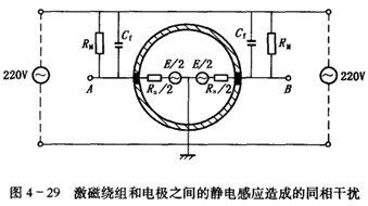一是由于激磁繞組和電極之間的靜電感應引起的同相干擾,如圖4-29所示,在激磁繞組和電極A, B之間存在絕緣電阻RM和分布電容Cf,激磁電壓通過RM和Cf及兩電極之間的內阻,對地產生同相的干擾電勢et。